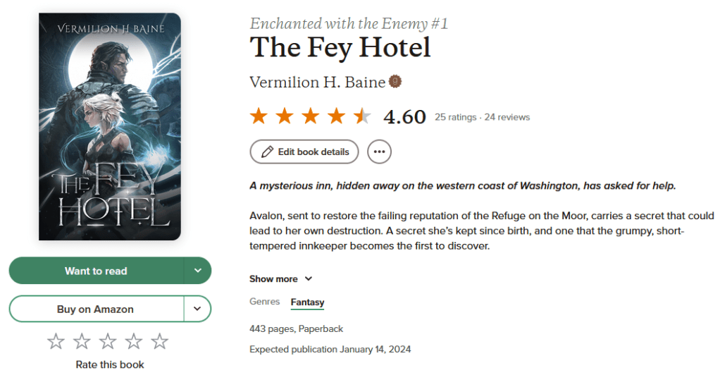 Happy holidays, everyone! I have exciting news! The Fey Hotel already has 24 reviews on Goodreads! I sent out around 100 ARC copies, and a typical return is around 20% for reviews. It’s great to hit that already! I’ll include my first review at the end!