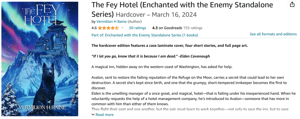 Other news about my hardcovers! I have published a hardcover version through KDP and IngramSpark. The Ingramspark version includes the dust jacket and has the vibrant feylands cover with Hob underneath. The KDP version only has the Hob cover and no dust jacket. It’s easy to tell the difference. I’ll show what the no dust jacket listing looks like. All other listings will show to OG cover.