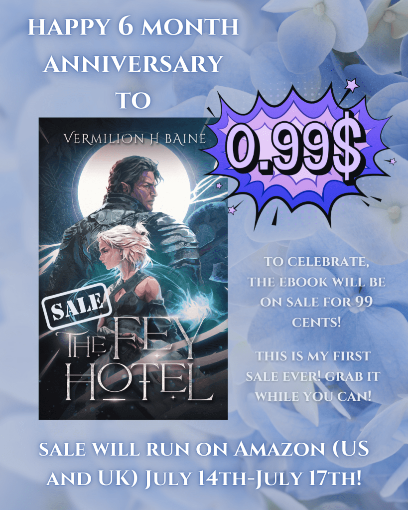Hello, readers! On July 14th, 2024, it will be the six month anniversary of publishing my debut novel, The Fey Hotel! To celebrate, I’ll be running a sale on Amazon (US and UK) on the ebook! If you want to snag the $0.99 ebook or share the sale (which I would really appreciate), I’ll include the link. This is my first sale EVER so grab it while you can! Sale will run July 14-17th, 2024. I will send a newsletter reminder of the sale on July 14th. The Fey Hotel Amazon Ebook